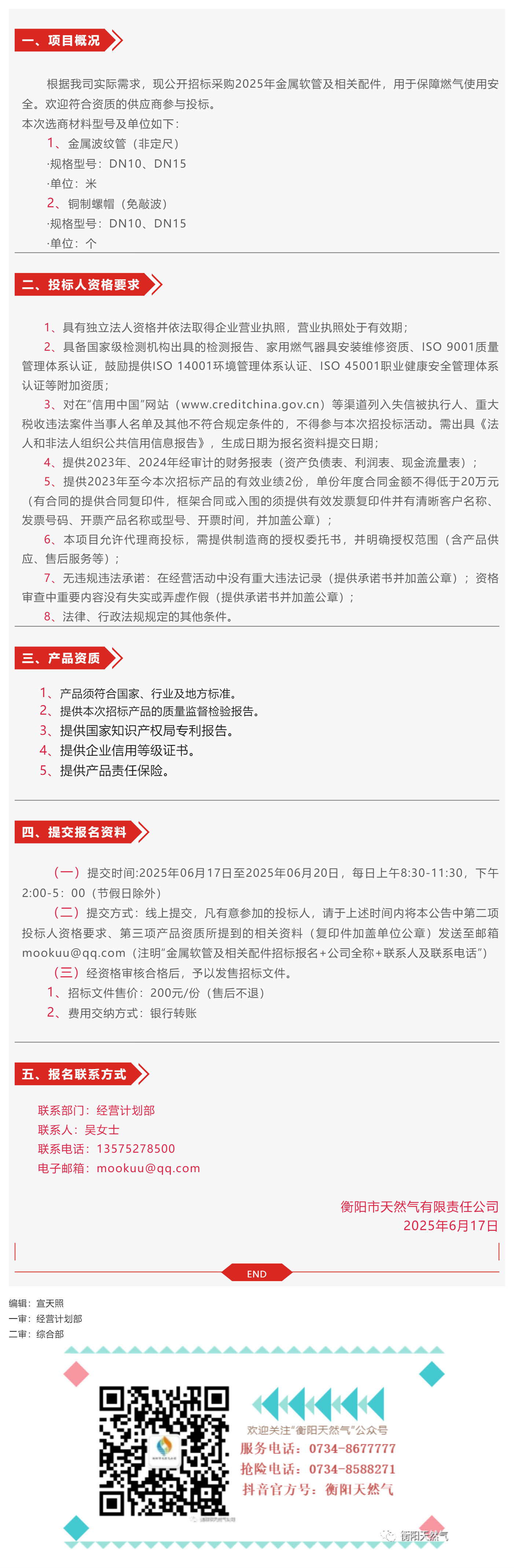 招標公告丨衡陽市天然氣有限責任公司2025年金屬軟管及相關配件采購招標公告